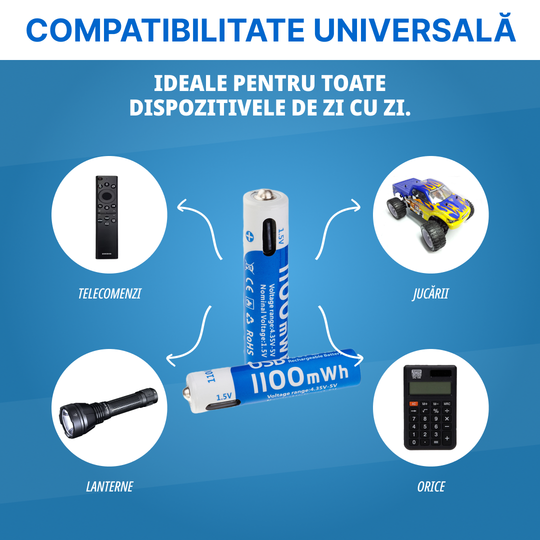 ✅ Set de 4 baterii AAA reîncărcabile – gata de folosire din cutie